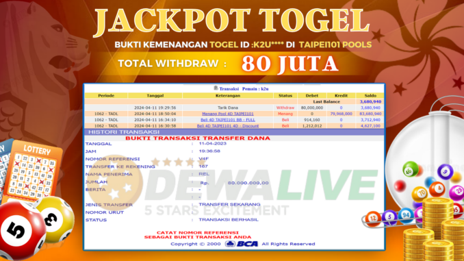 DEWALIVE JACKPOT TOGEL DI TAIPEI101 POOLS Rp 80.000.000,- LUNAS